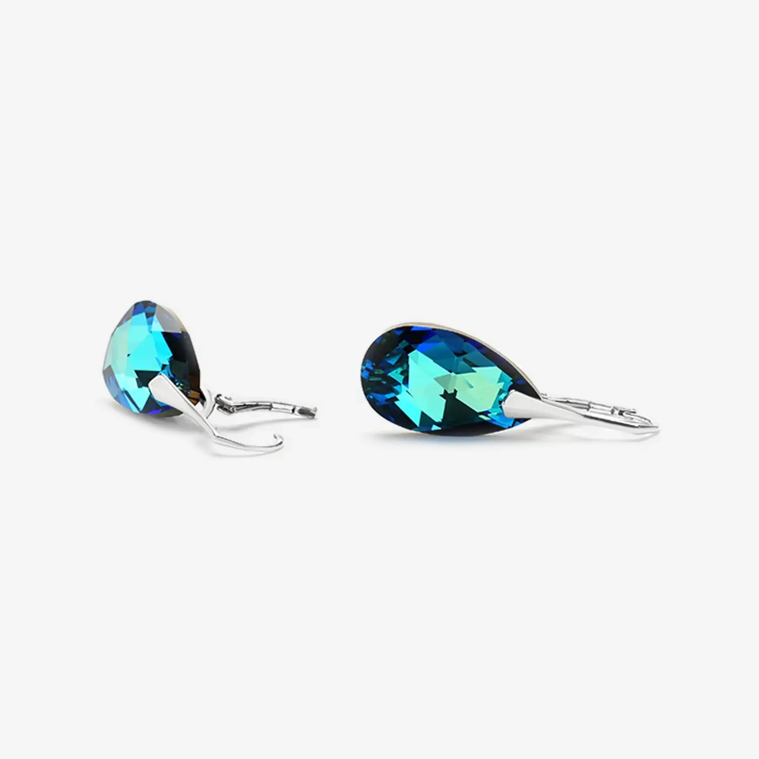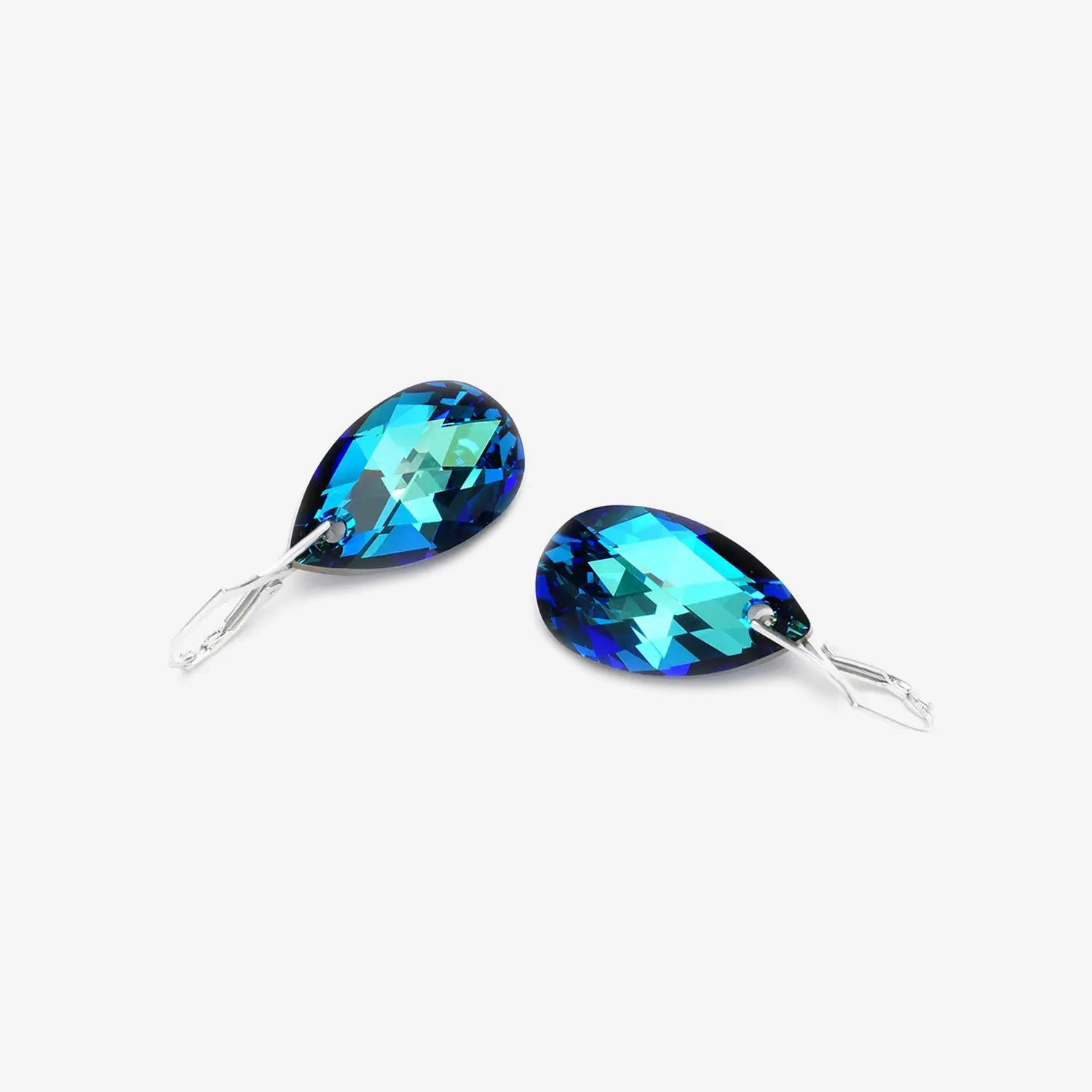 Pełen wymownej głębi, komplet biżuterii srebrnej, składający się z kolczyków oraz zawieszki z największymi kryształami Almond. Wszystkie elementy są utrzymane w tym samym stylu. Ich duszę stanowią duże kryształy Swarovskiego Elements w niesamowitym kolorze Bermuda Blue. Głębię lśnienia uzyskano dzięki pokryciu kryształu specjalną powłoką tyłu kryształu.