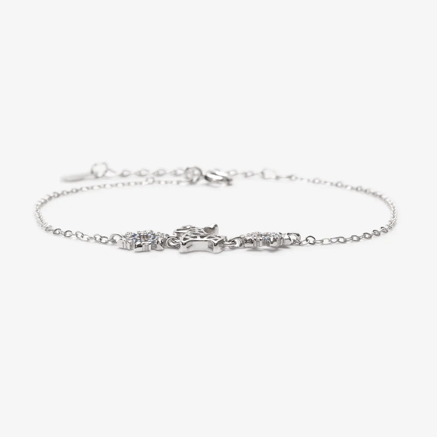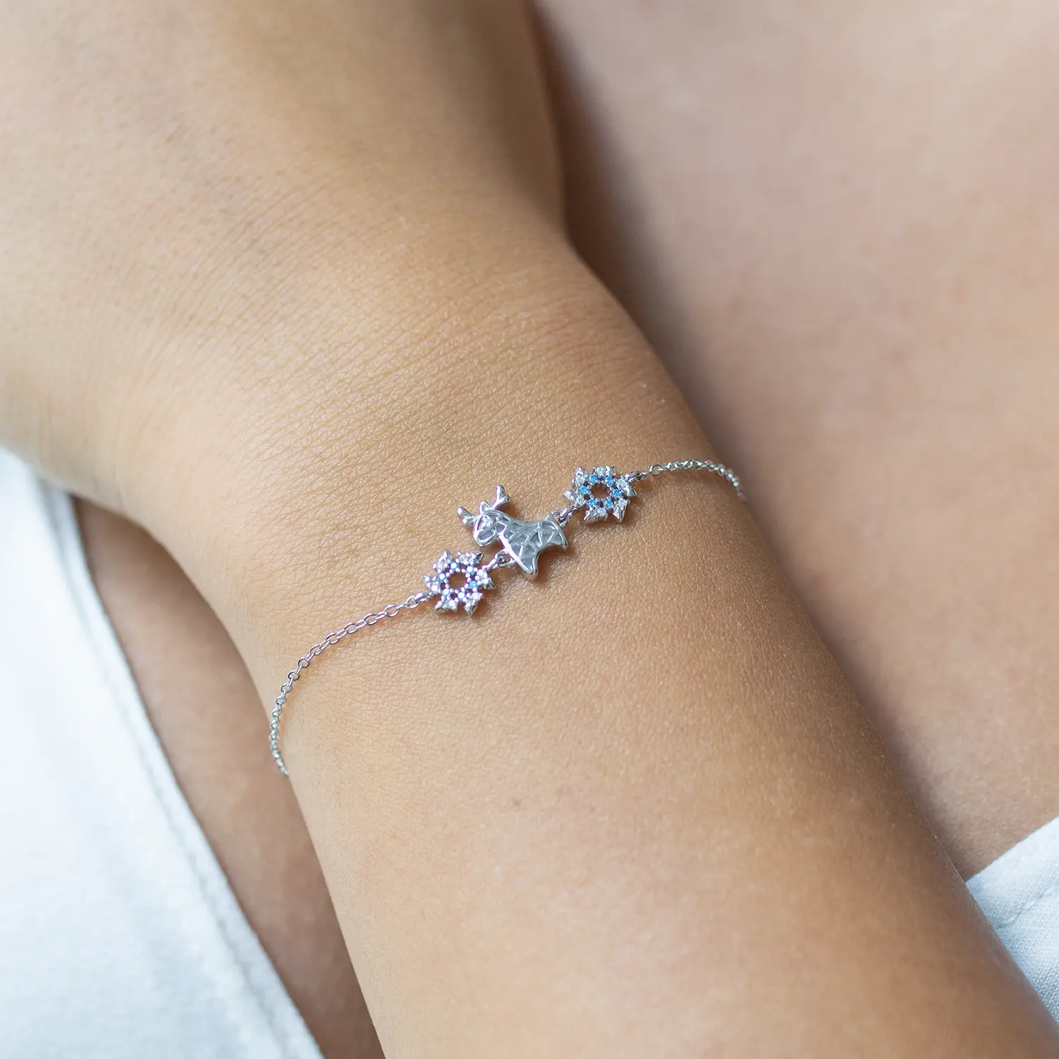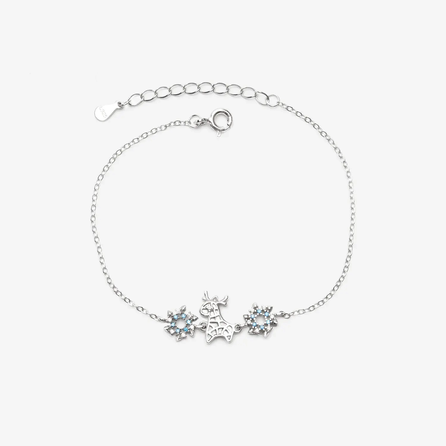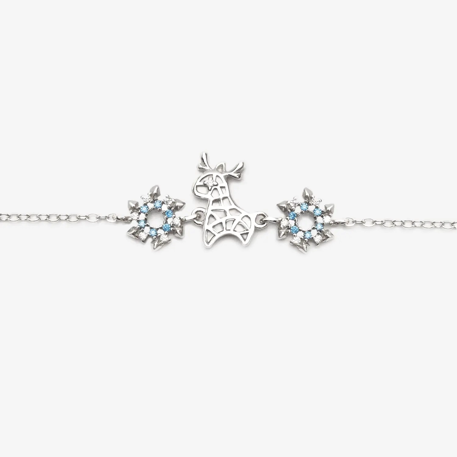 Bransoletka została wykonana ze srebra próby 925. Ozdobiona malutkim, słodkim reniferem. Takim subtelnym, nieoczywistym symbolem odporności, wewnętrznej siły i czułości. Jego tułów wypełnia masa perłowa w lodowym odcieniu, jak zamarznięta tafla jeziora o poranku. Po bokach rozchodzą się dwa delikatne płatki śniegu, zdobione cyrkoniami w odcieniach bieli i błękitu. To właśnie one migoczą pod światłem jak lodowe kryształki w promieniach zimowego słońca.