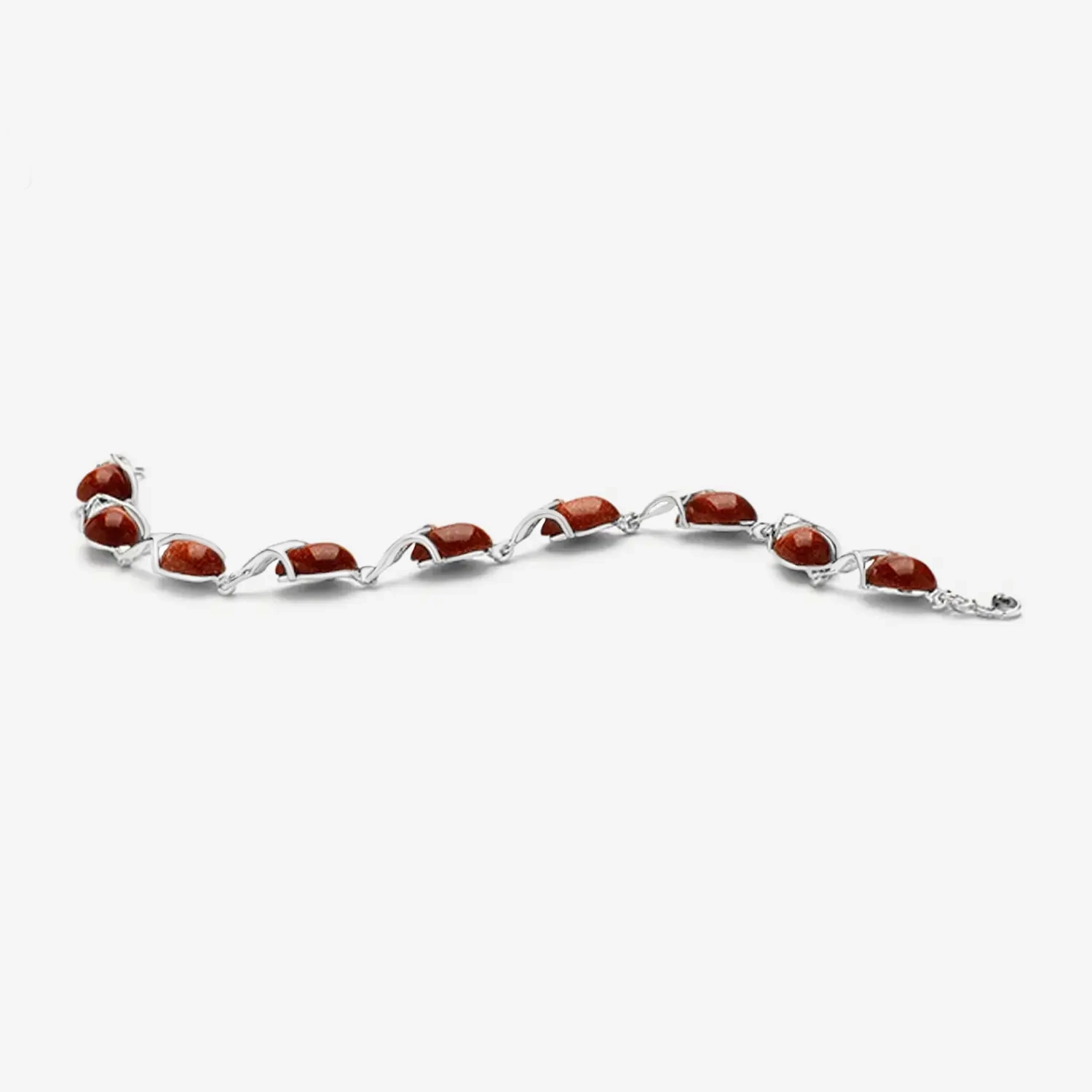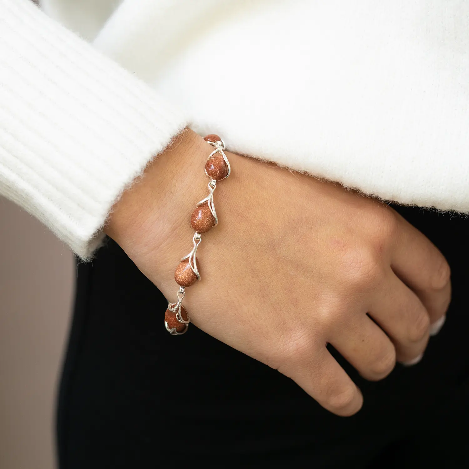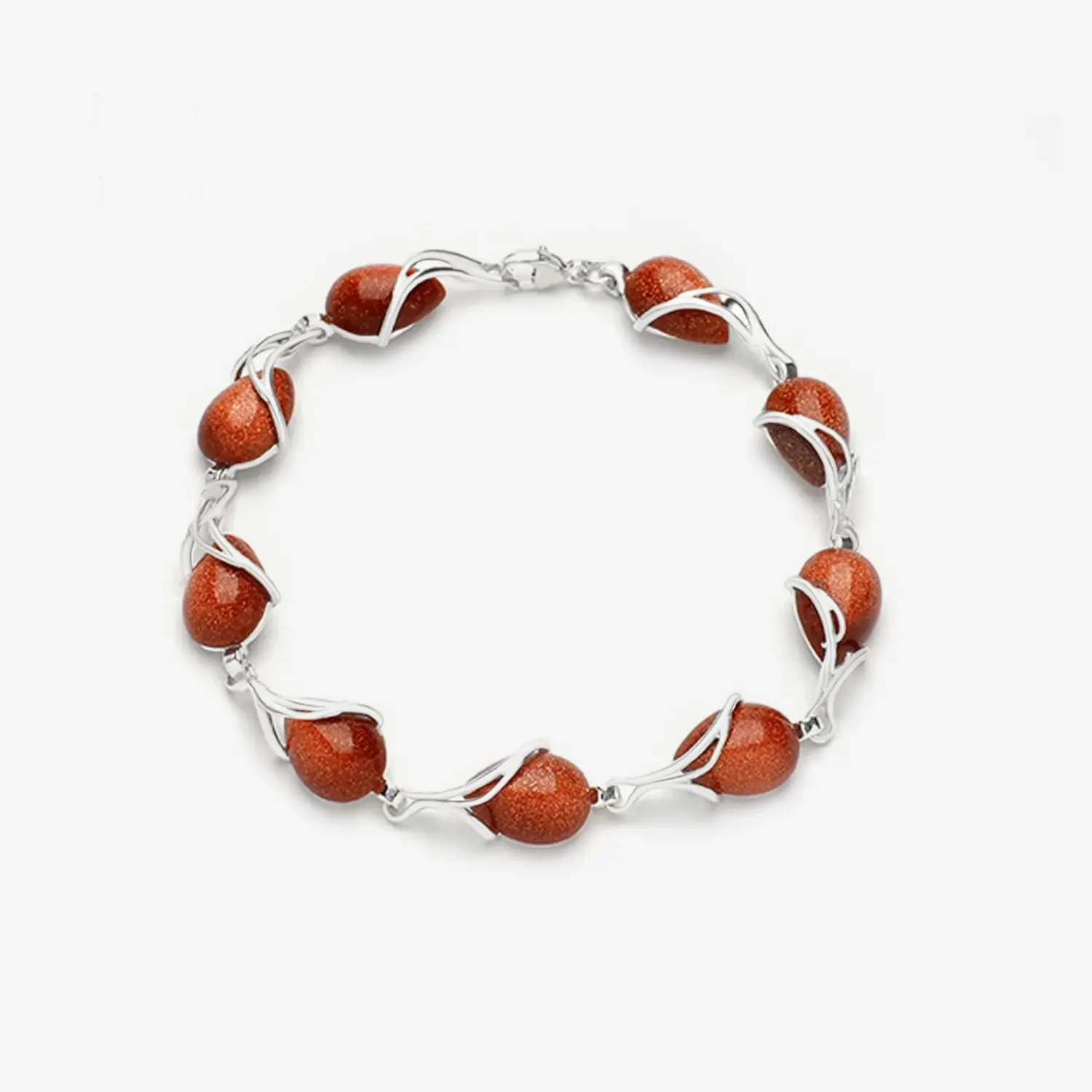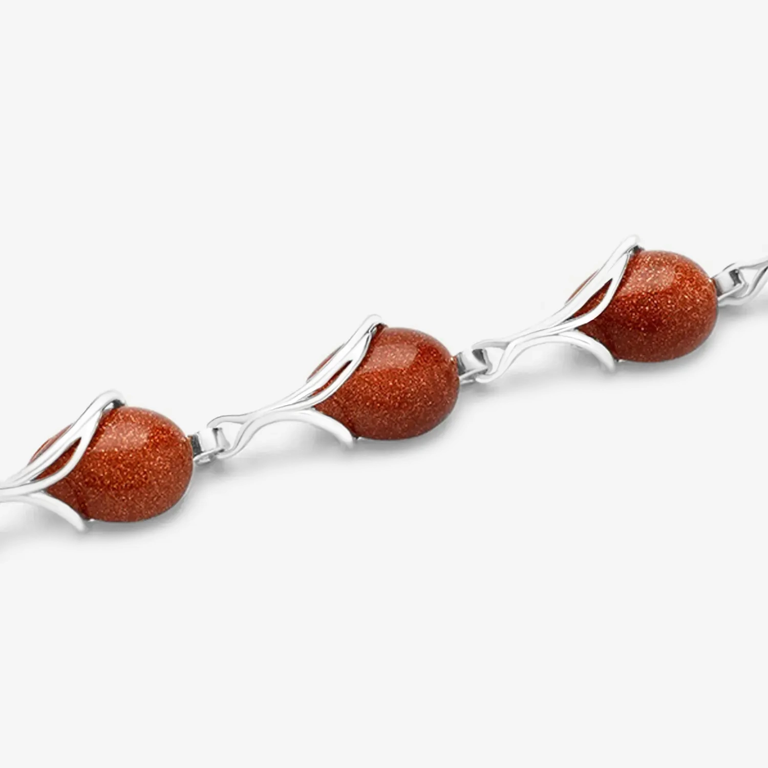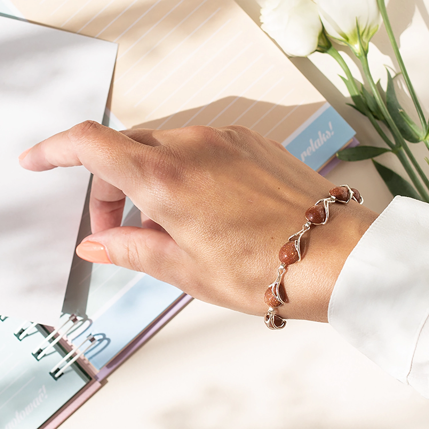 Ta wyjątkowa bransoletka srebrna z piaskiem pustyni jest ozdobiona kamieniami tzw Piasek Pustyni lub Kamień Szczęścia. Kamienie te zostały misternie oprawione w srebrne uchwyty przypominające delikatne gałązki. Kształt tych srebrnych uchwytów symbolizuje naturalne piękno i harmonijną jedność z naturą. Piasek pustyni, zwany także kamieniem szczęścia, mieni się delikatnym blaskiem, przypominając promienie słońca odbijające się od pustynnych wydm. Jego ciepły, złoty kolor symbolizuje bogactwo i sukces, a jednocześnie łagodzi emocje, wprowadzając spokój i równowagę.