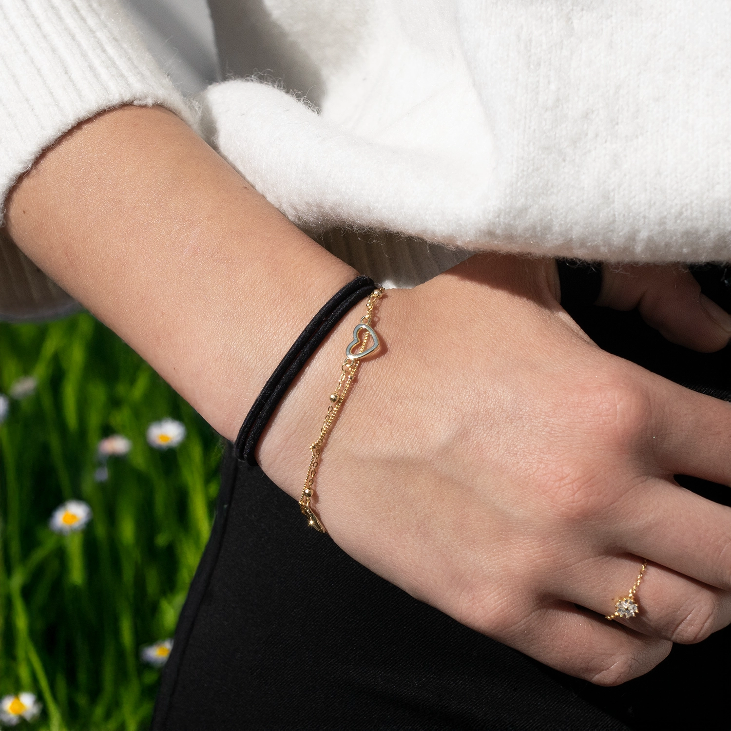 Oba łańcuszki posiadają proste sploty ankier typu satelitka. Łańcuszek wewnętrzny ma prosty, a zarazem drobny splot z 7 malutkimi kuleczkami. Całość wprowadza wizualną czystość i poczucie lekkości. Drugi łańcuszek zewnętrzny, posiada grubsze oczka, które są ozdobione dwoma ramkami serduszek i regularnie rozmieszczonymi kuleczkami. Taka wersja dodaje miękkiego pulsu i subtelnej gry światła. Ten kontrast sprawia, że bransoletka wygląda bardzo urzekająco, ponieważ pozostaje spokojna w odbiorze. W psychologii form powtarzalność i symetria kojarzą się z bezpieczeństwem, a także równowagą, co wyraźnie jesteś w stanie odczuwać podczas noszenia.