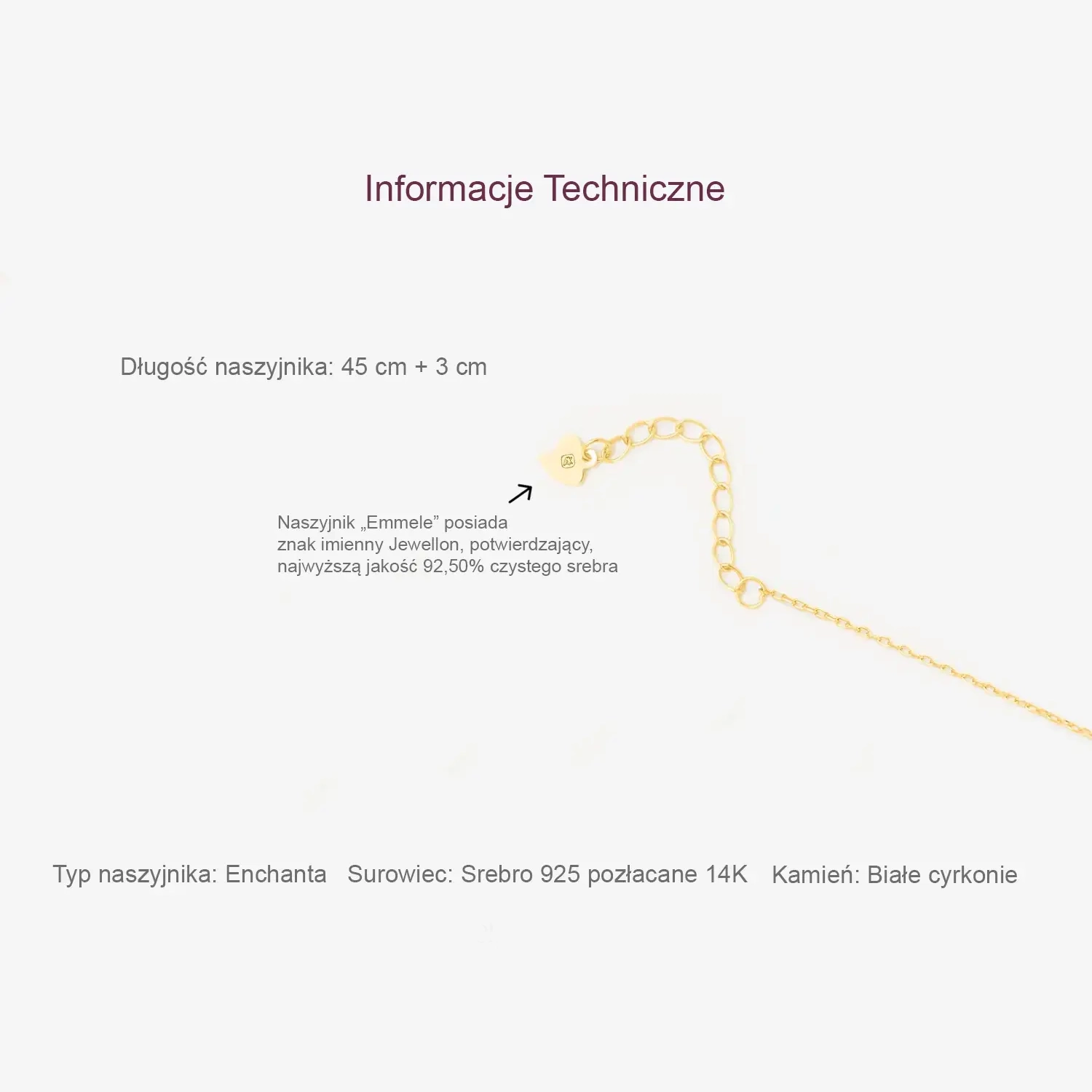 Pozłacany naszyjnik srebrny z kolekcji Emmele został zaprojektowany z myślą o wszechstronności i ponadczasowej elegancji. Idealnie komponuje się z większymi dekoltami, koszulami w kształcie trójkąta oraz zwisający pod zapiętym kołnierzykiem w koszuli. Dodaje również uroku swetrom i golfom, stając się wyjątkowym akcentem każdej stylizacji. Jego klasyczny, a zarazem elegancki kształt sprawia, że naszyjnik ten staje się nieodzownym elementem garderoby każdej kobiety.