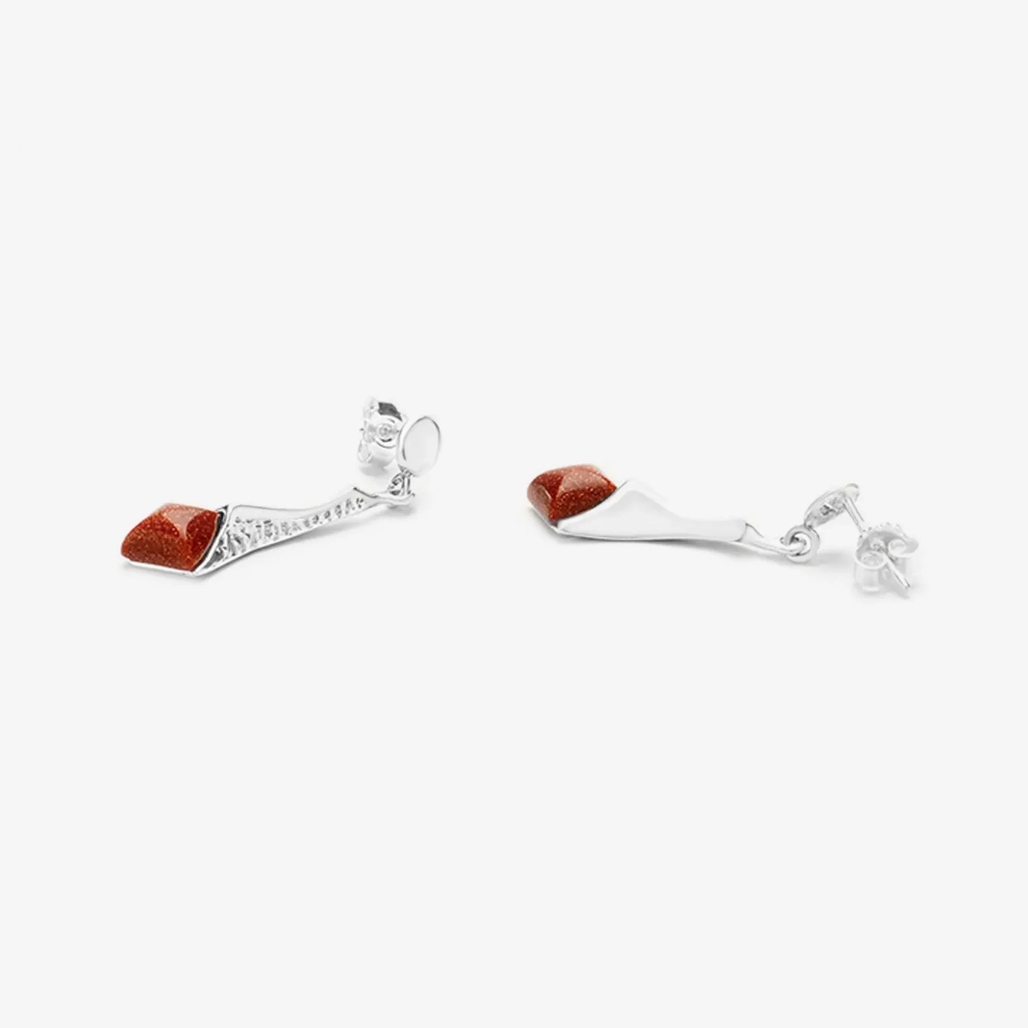 Kamień oprawiony jest w srebrną ramę, której linia płynnie unosi się ku górze i kończy delikatnym owalem, zakrywającym dziurkę w uchu. To rozwiązanie zapewnia estetykę nawet przy lekko rozciągniętych przekłuciach. Po jednej stronie srebrnej powierzchni widoczny jest subtelny, fakturowany wzór, który przywodzi na myśl naturalną strukturę. Taką nieco surową, a jednocześnie elegancką, która dodaje całości artystycznego charakteru. Kolczyki typu wkrętki i zawieszka tworzą spójną całość, w której połysk srebra harmonijnie kontrastuje z głębią i magią Piasku Pustyni To czyni ten komplet wyrazistym dodatkiem na co dzień i na wyjątkowe okazje.