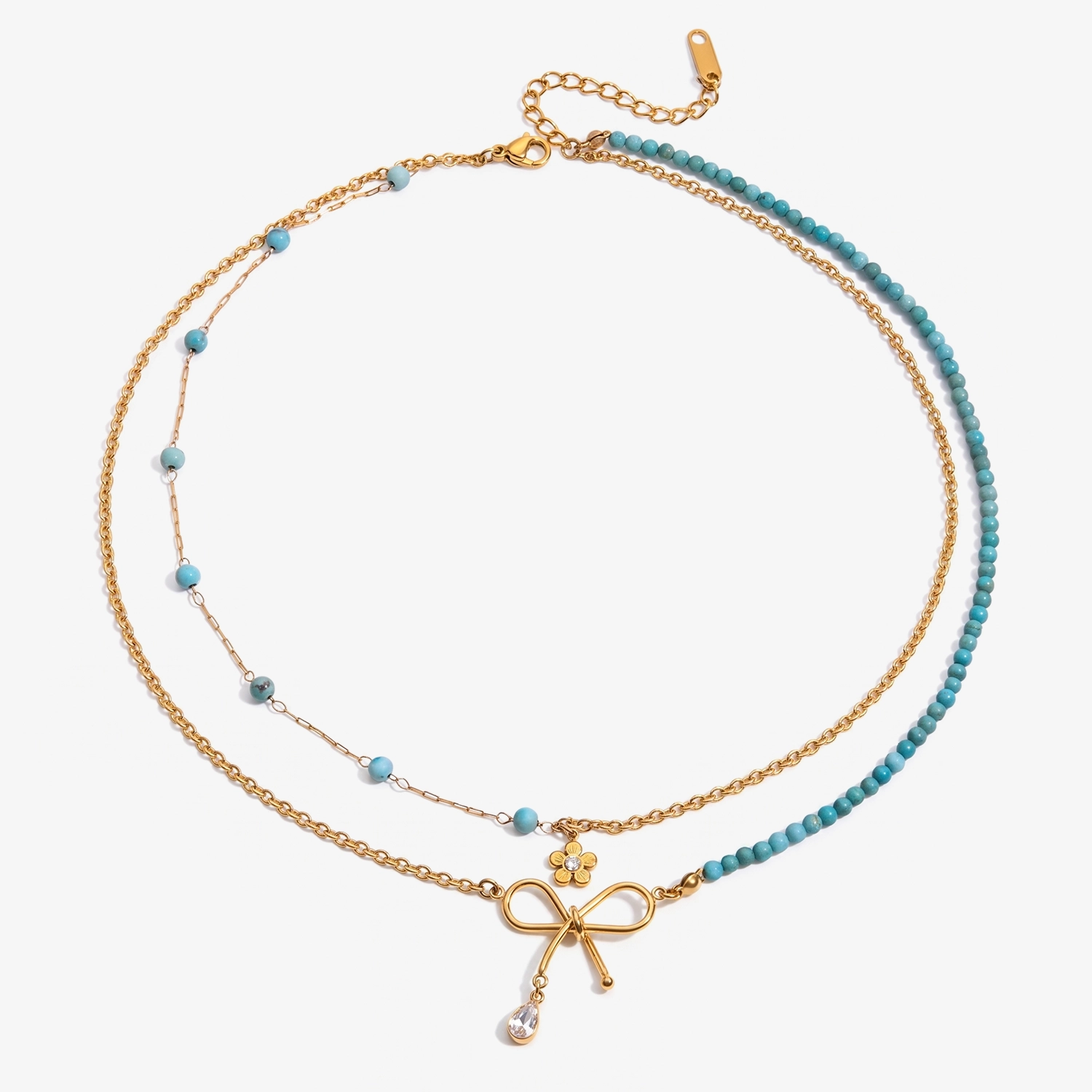 Złota kokarda i zawieszka w formie kropli przyciągają wzrok, ponieważ kontrastują z matowym turkusem. Cyrkonia w kształcie kropli zwisającej z kokardki reaguje na ruch i tworzy świetlne refleksy. Górna warstwa z kwiatuszkiem wprowadza romantyczny akcent i równoważy kompozycję. Błękit kamieni podkreśla ciepło złota i wzmacnia letni charakter biżuterii. Polerowane powierzchnie odbijają światło, dlatego naszyjnik kaskadowy zachowuje dynamiczny efekt. Całość podkreśla opaleniznę i naturalny koloryt skóry.