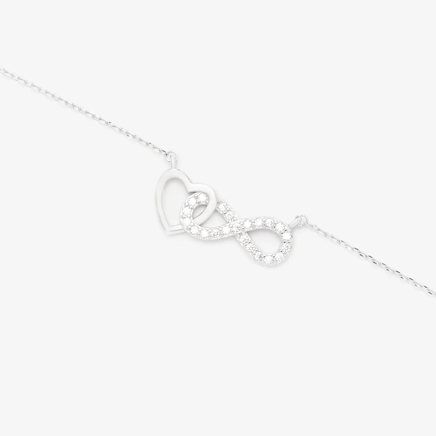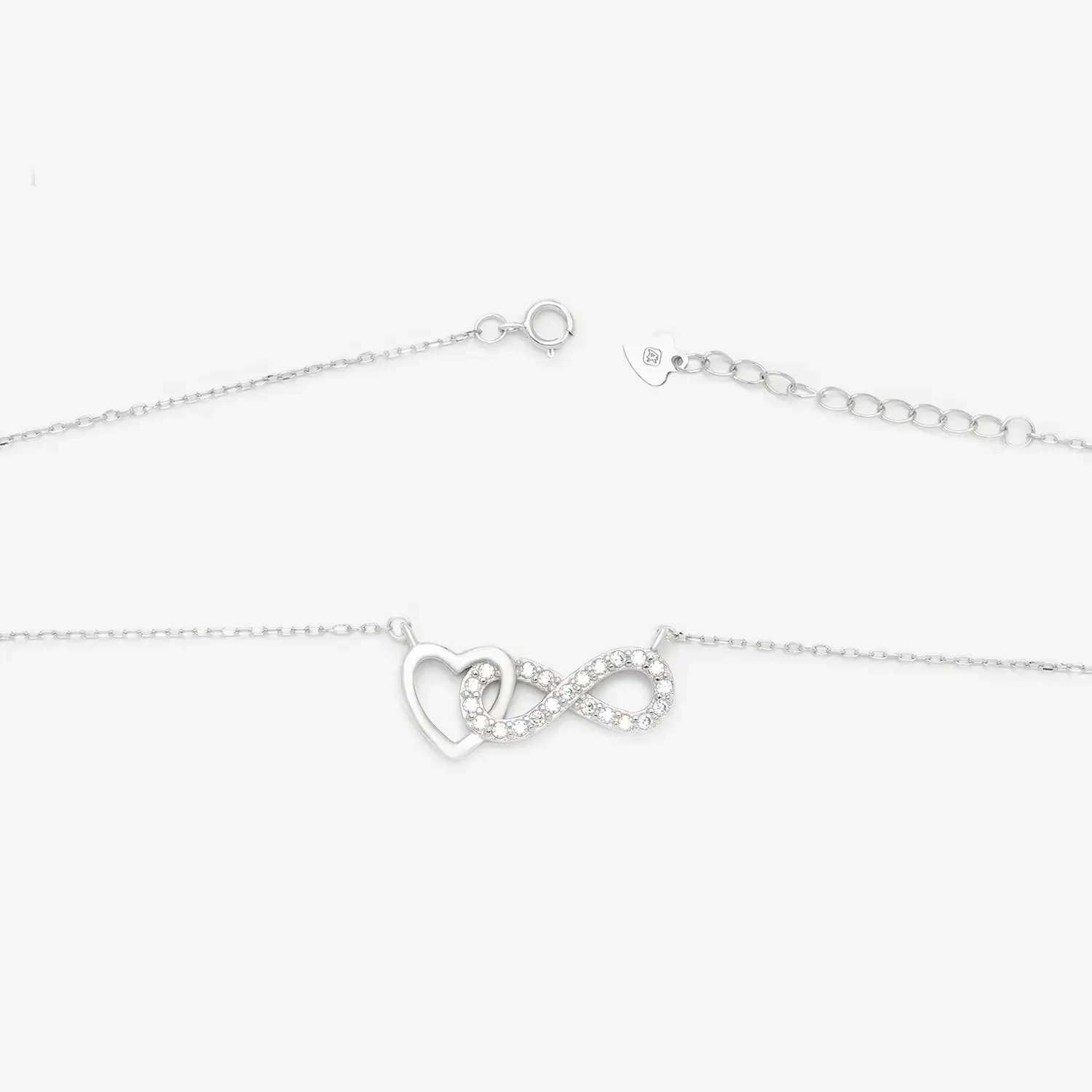 Naszyjnik srebrny Niekończąca się Miłość mierzy w emocje i wykonuje to z finezją. Srebrna ramka w kształcie serca delikatnie obejmuje znak nieskończoności. Znak, który jest wysadzany białymi cyrkoniami, które podczas każdego ruchu odbijają światło, niczym pierwsze promienie słońca. Srebro próby 925, które jest rodowane dla trwałości i chłodnego blasku, zapewnia wyjątkową elegancję, ale i odporność, ponieważ nie ciemnieje, jak i nie traci formy, dlatego zachowuje emocjonalny wymiar przez lata.