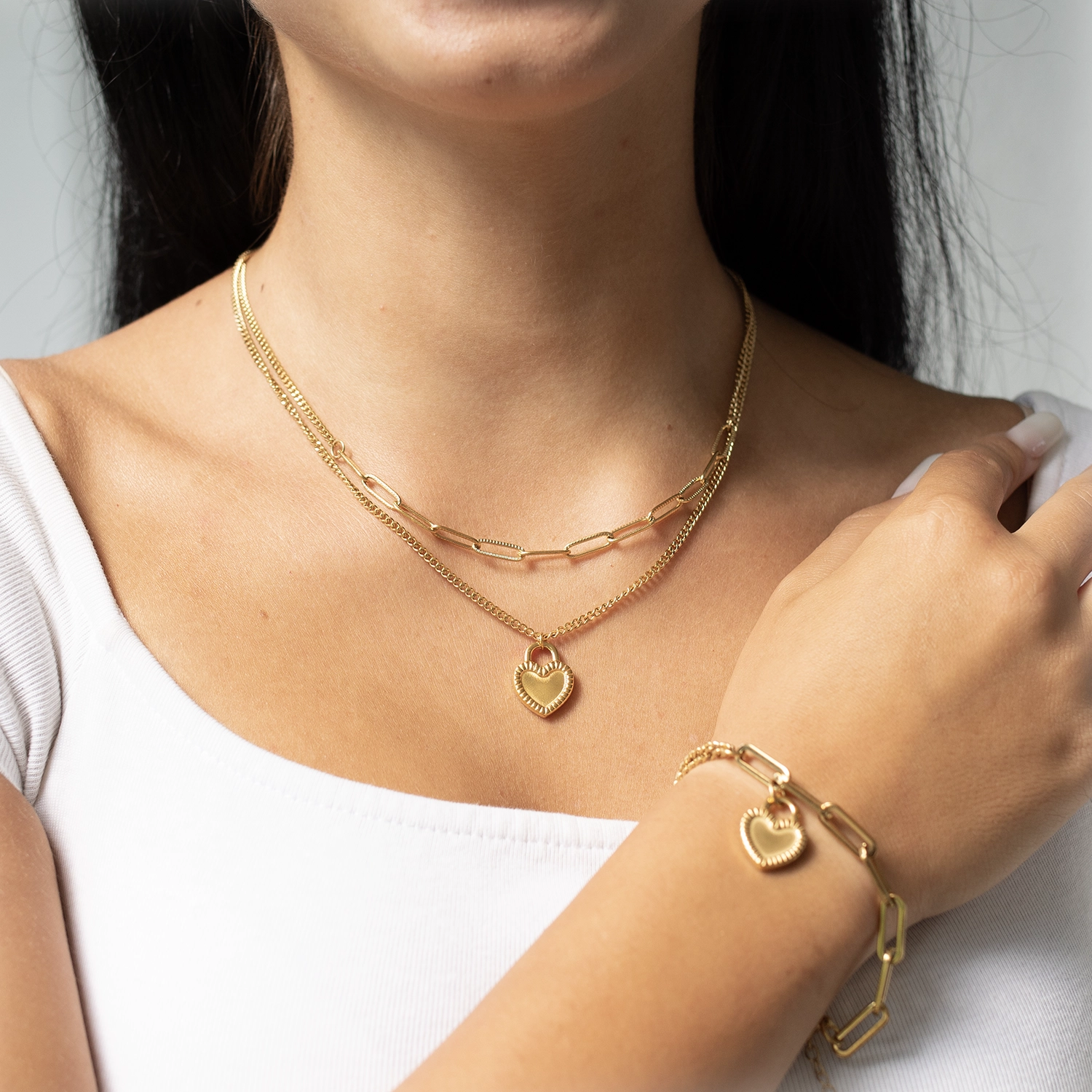 Zachwyć się blaskiem, który subtelnie otuli szyję i podkreśli Twój codzienny, a także romantyczny styl. Dwuwarstwowy naszyjnik LoveNelle ze stali szlachetnej, który został pozłacany złotem 18K, wyróżni Cię elegancją i nowoczesną energią. Górny, cienki łańcuszek delikatnie spoczywa przy szyi, dodając jej lekkości. Dolny splot łańcuszka typu paperclip (spinaczowy) przyciąga spojrzenia, ponieważ tworzy wyrazisty, modny akcent.