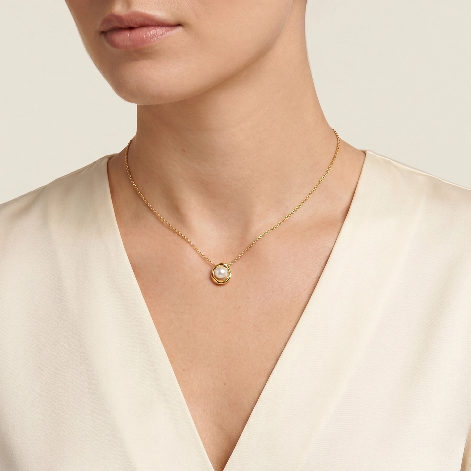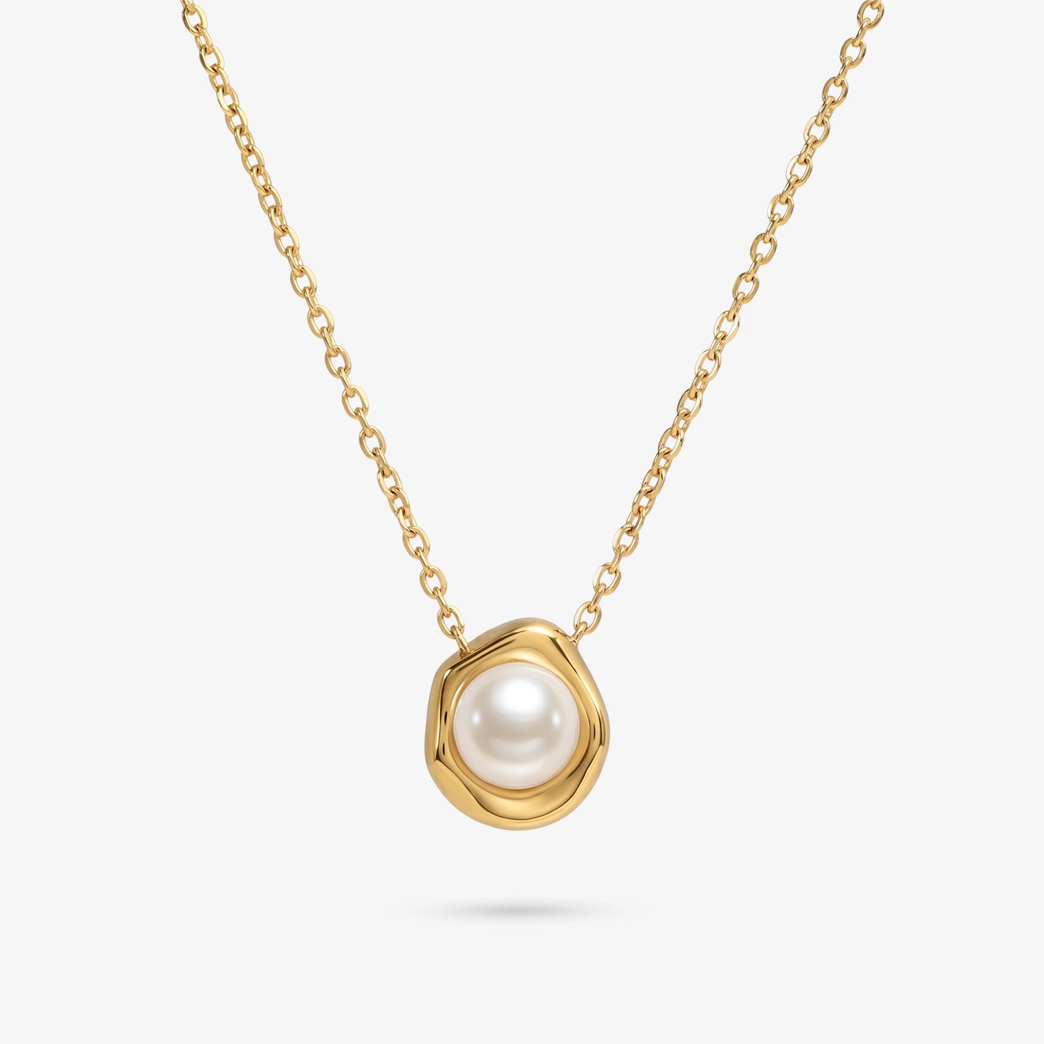 Centralna perła syntetyczna przyciąga uwagę, ponieważ jej gładka powierzchnia kontrastuje ze złotą oprawą. Oprawa inspirowana płynnym metalem, złotą lawą otacza perłę, a jednocześnie wzmacnia jej jasny, czysty odcień. Każdy Twój ruch uruchomi refleksy światła, dlatego też pozłacany naszyjnik ze stali pozostaje dynamiczny i nie wygląda statycznie. Perełka ma idealnie gładką powierzchnię i satynowy połysk. Biel kontrastuje z ciepłem złota, a sposób, w jaki światło załamuje się na jej krawędziach, nadając jej naturalnego wyglądu. Złocona powierzchnia odbija światło, a przy tym podkreśla ciepło skóry i jej naturalny koloryt. Całość tworzy efekt nowoczesnego luksusu, który przyciąga uwagę bez nadmiaru.