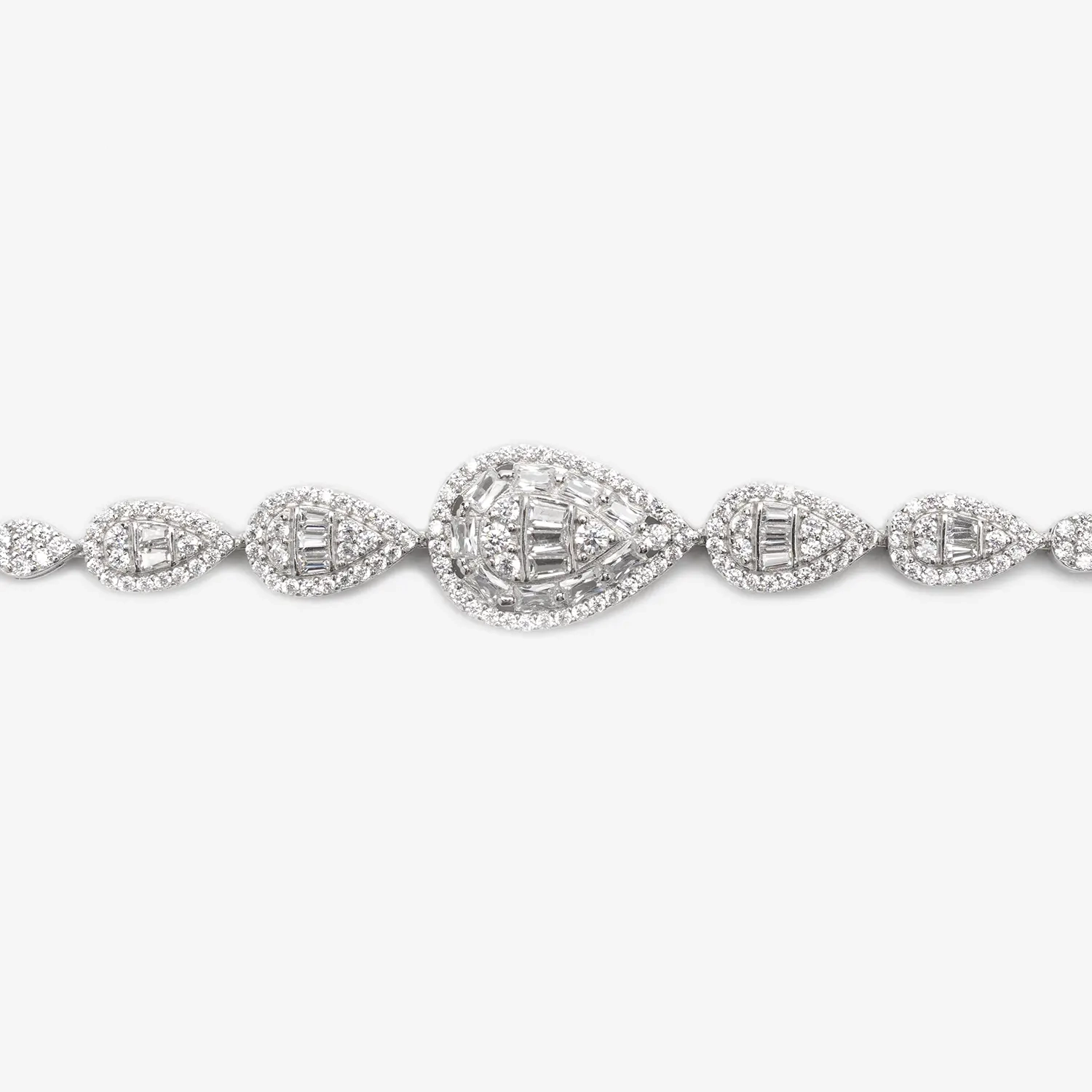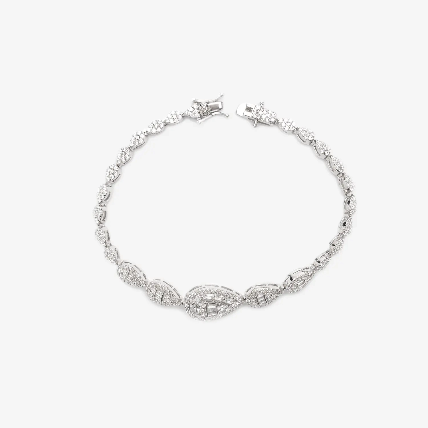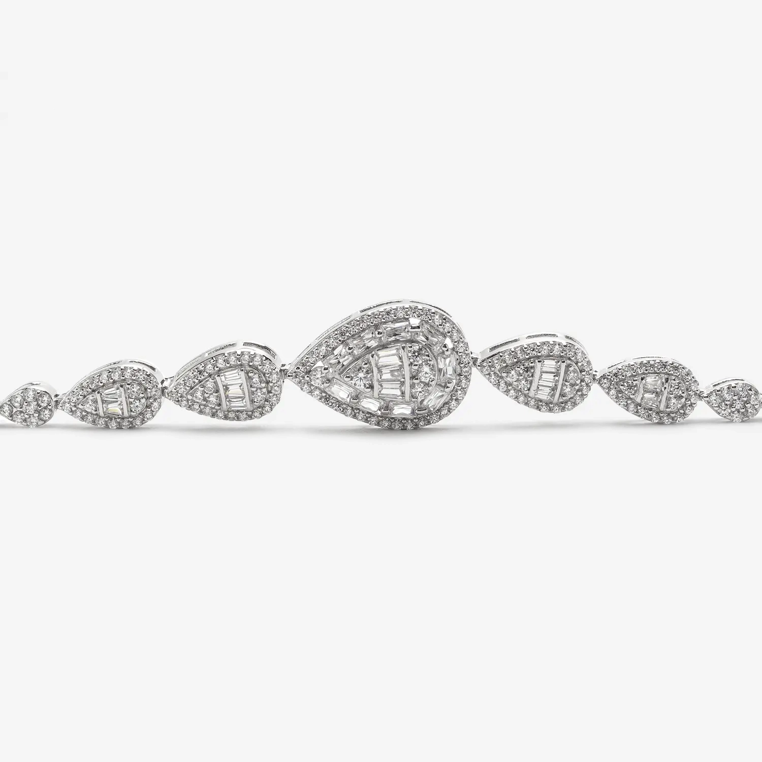 To bransoletka ze srebra 925, które jest rodowane. Dzięki temu zachowuje chłodny, czysty połysk przez lata i posiada ochronę powierzchnię przed utlenianiem. Konstrukcję bransoletki tworzą srebrne krople wysadzane białymi cyrkoniami. Największa stanowi serce kompozycji, a mniejsze, rozmieszczone po bokach, układają się jak świetliste echa pierwszego wzruszenia. Każdy mikroszlif cyrkonii został ustawiony w taki sposób, aby maksymalnie złapać i odbić światło pod różnymi kątami. Dzięki temu przy każdym ruchu dłoni, srebrna bransoletka do ślubu płynie blaskiem, a nie „miga”. To różnica, którą zobaczysz na zdjęciach i nagraniach wideo i którą zauważą oczy wszystkich obecnych.