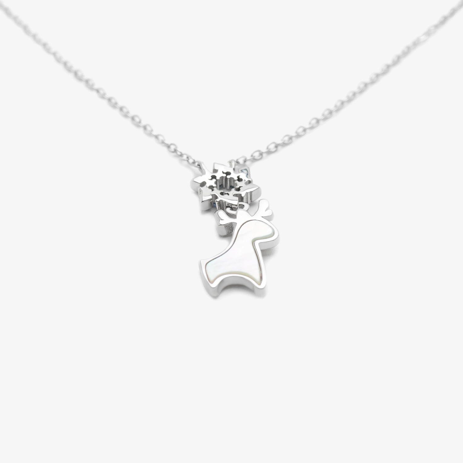 Naszyjnik Glacia łączy lekkość, a także elegancję i subtelny urok zimowego krajobrazu, który możesz nosić przez cały rok. Malutki renifer wykonany ze srebra 925 został ozdobiony masą perłową, która podkreśla jego urok. Nad głową renifera umieściliśmy płatek śniegu wysadzany białymi i niebieskimi cyrkoniami, które migoczą niczym lodowe kryształki w promieniach słońca. Ten drobny detal symbolizuje harmonię, spokój i magię zimy, dodając każdej stylizacji wyjątkowego charakteru.