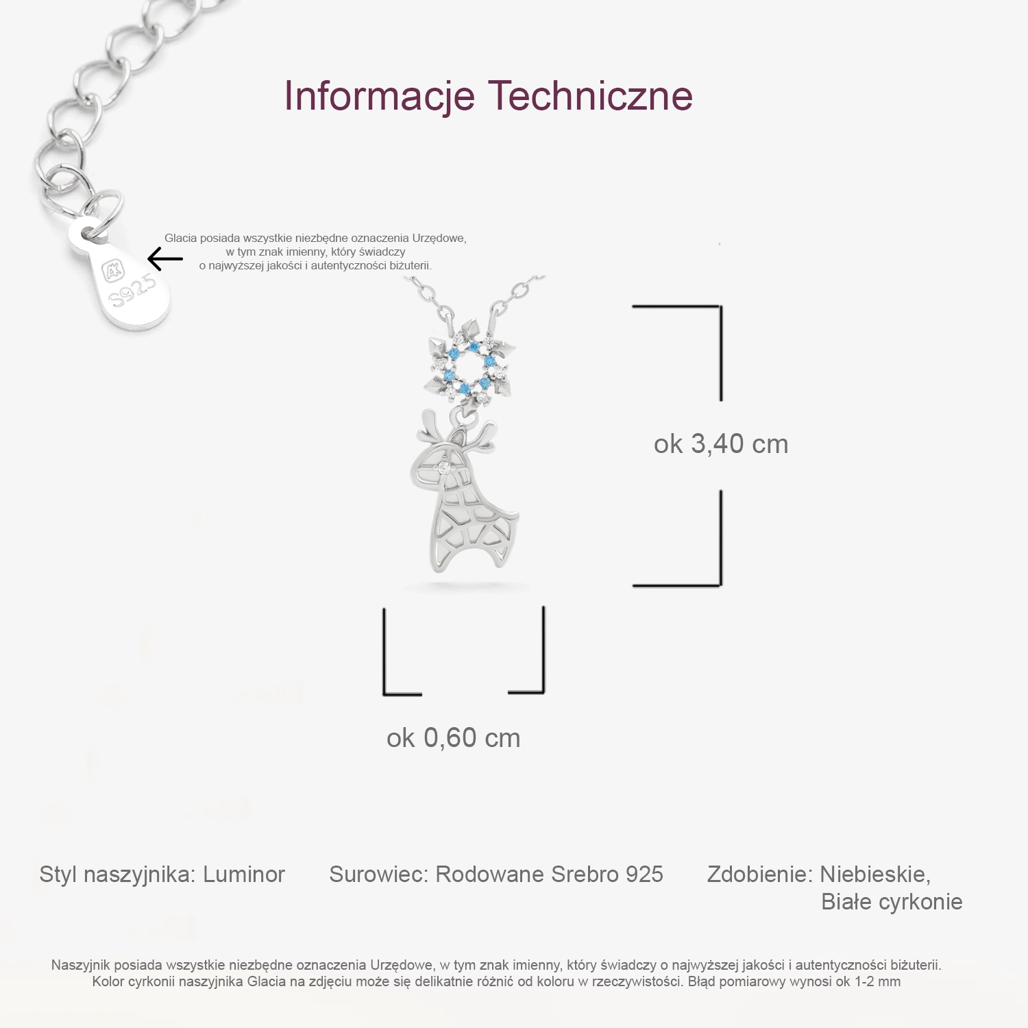 Srebrny naszyjnik próby 925 z reniferem – Glacia – posiada wszystkie niezbędne urzędowe oznaczenia, w tym znak imienny, który świadczy o najwyższej jakości i autentyczności tego produktu.