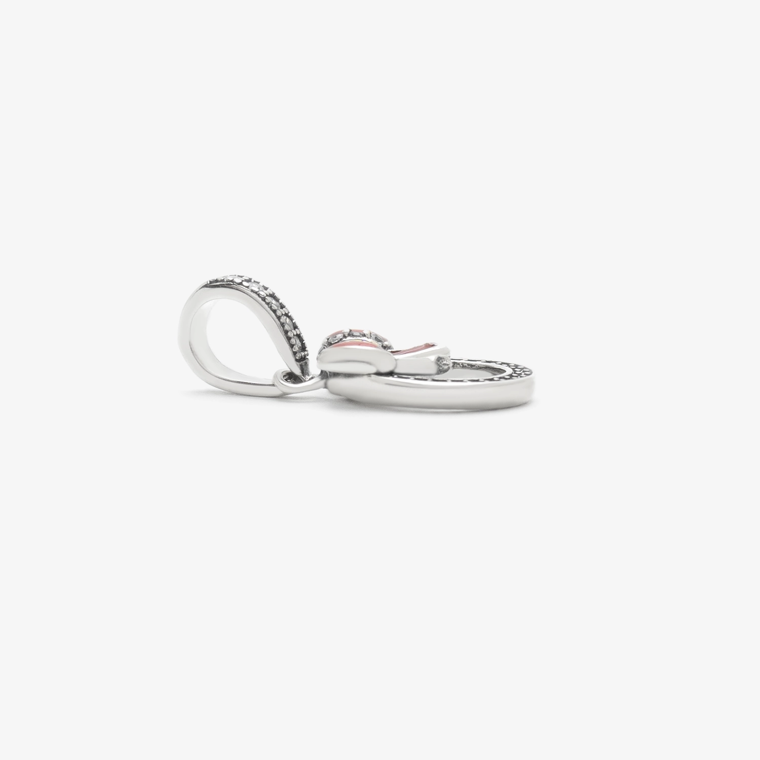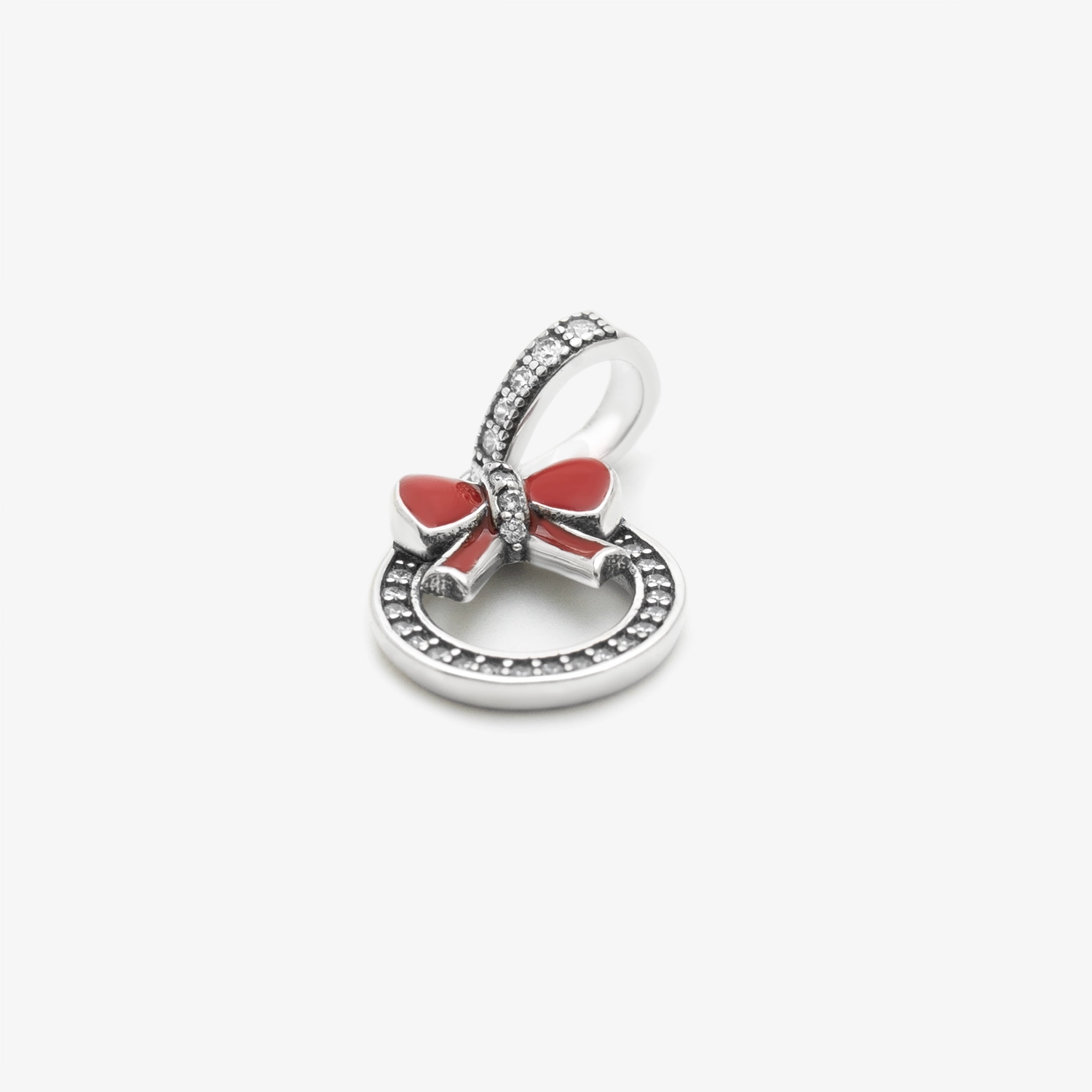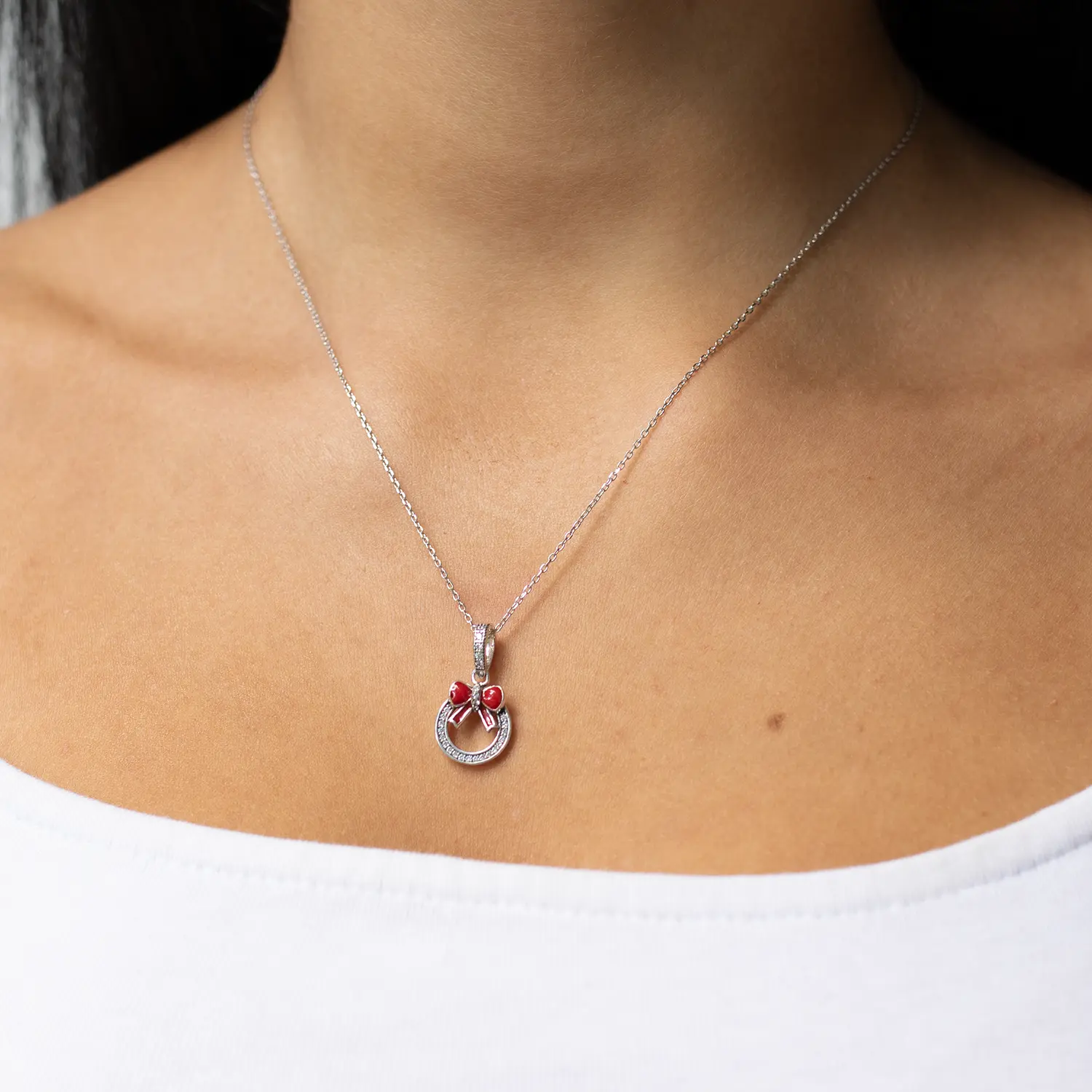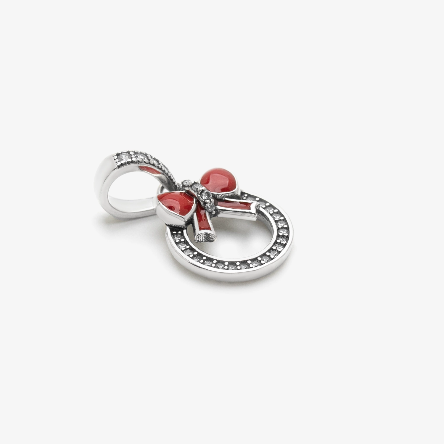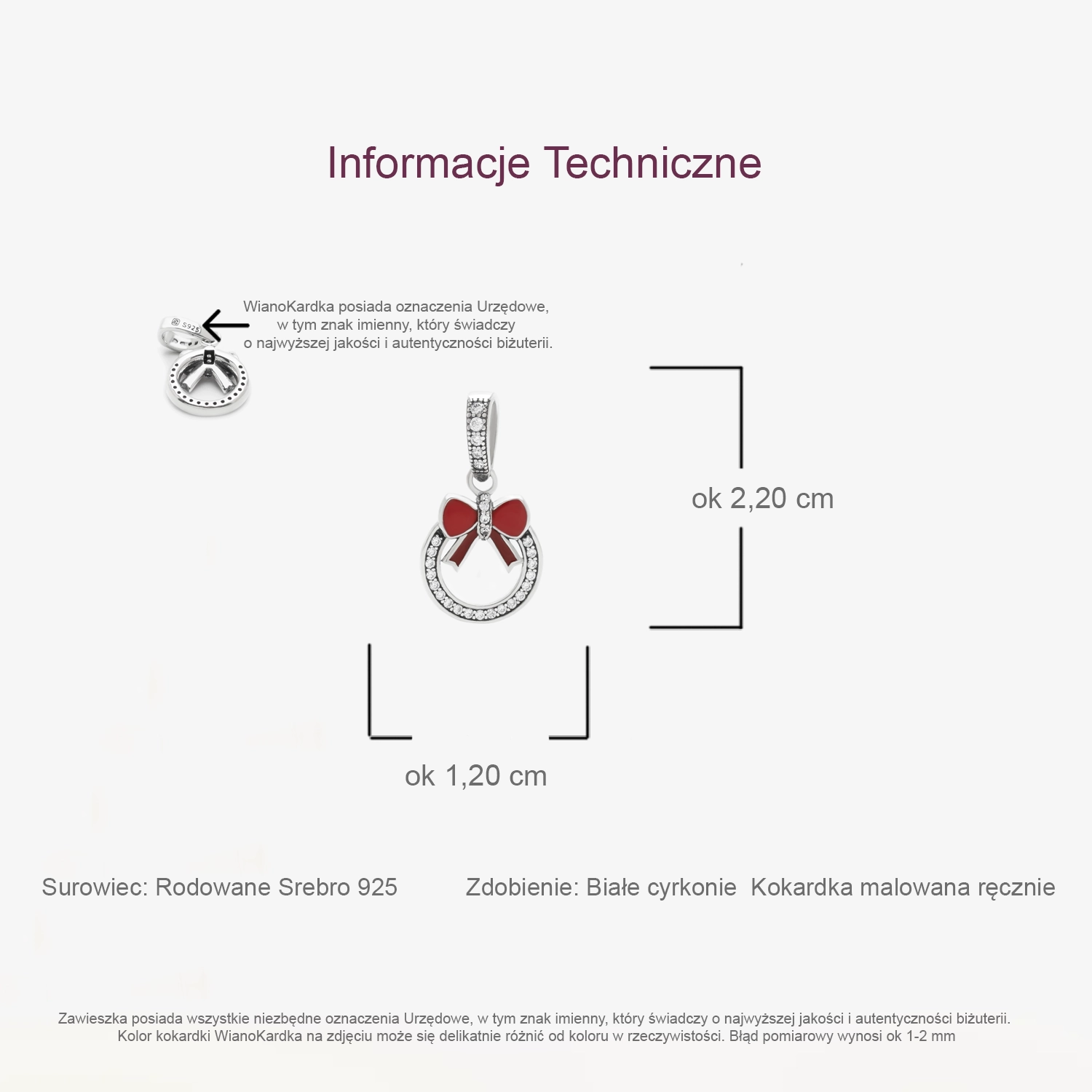 Główną część zawieszki tworzy perfekcyjnie wykrojony wianuszek, który otacza rząd lśniących i precyzyjnie oszlifowanych cyrkonii. Każdy kamień odbija światło, tworząc efekt migotania, który przyciąga wzrok oraz podkreśla elegancję tego projektu. W górnej części zawieszki umieściliśmy ręcznie malowaną kokardkę, w rubinowym odcieniu czerwieni. Symbolizuje ona miłość, wdzięczność i celebrację wspólnych chwil, a jednocześnie dodaje całości szlachetnego charakteru. Dzięki temu każdy element harmonijnie łączy się z pozostałymi i tworzy kompozycję pełną znaczeń oraz subtelnych emocji.