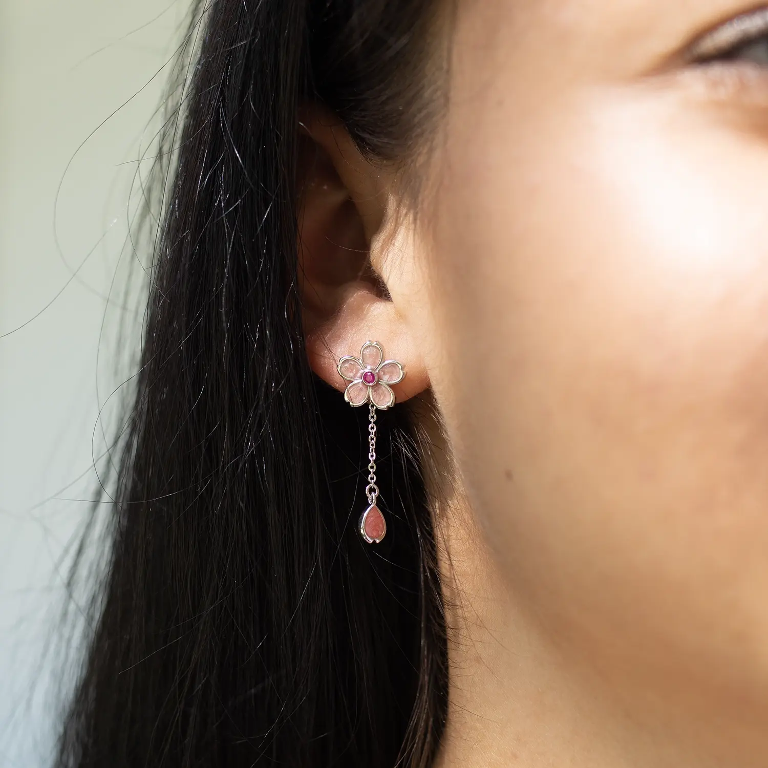 Wkrętki kolczyki ze srebra 925 wiszące, wykonano ze srebra próby 925. To właśnie ten metal zachwyca nas swoim chłodnym i księżycowym blaskiem. Od wieków srebro łączone jest z intuicją, ochroną i świadomością własnych emocji. W kształcie kwiatu, każdy płatek wypełnia różowa masa perłowa, a centralna bordowa cyrkonia przyciąga wzrok, niczym serce rozkwitającego uczucia. Wiszące łańcuszki, można łączyć z kolczykiem i zdejmować. Dzięki temu można tworzyć wiele stylizacji, która jest wiązana z lekką asymetrią, jak i klasyczną subtelnością.