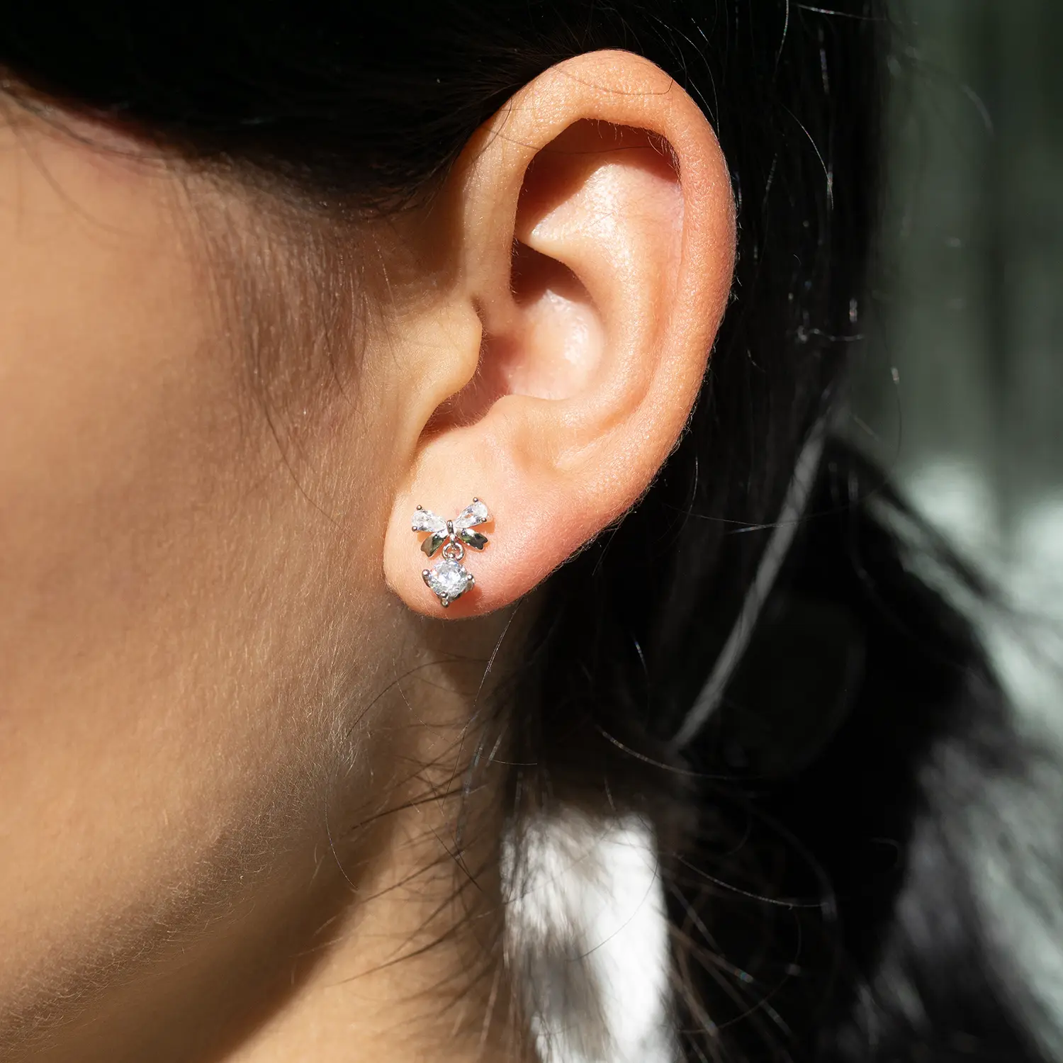 Delikatna kokardka nadaje kolczykom niepowtarzalny charakter, przywodząc na myśl momenty pełne uroku i elegancji, jak wspomnienie wczesnych lat, gdy kokardki były nieodłącznym elementem dziecięcych fryzur.