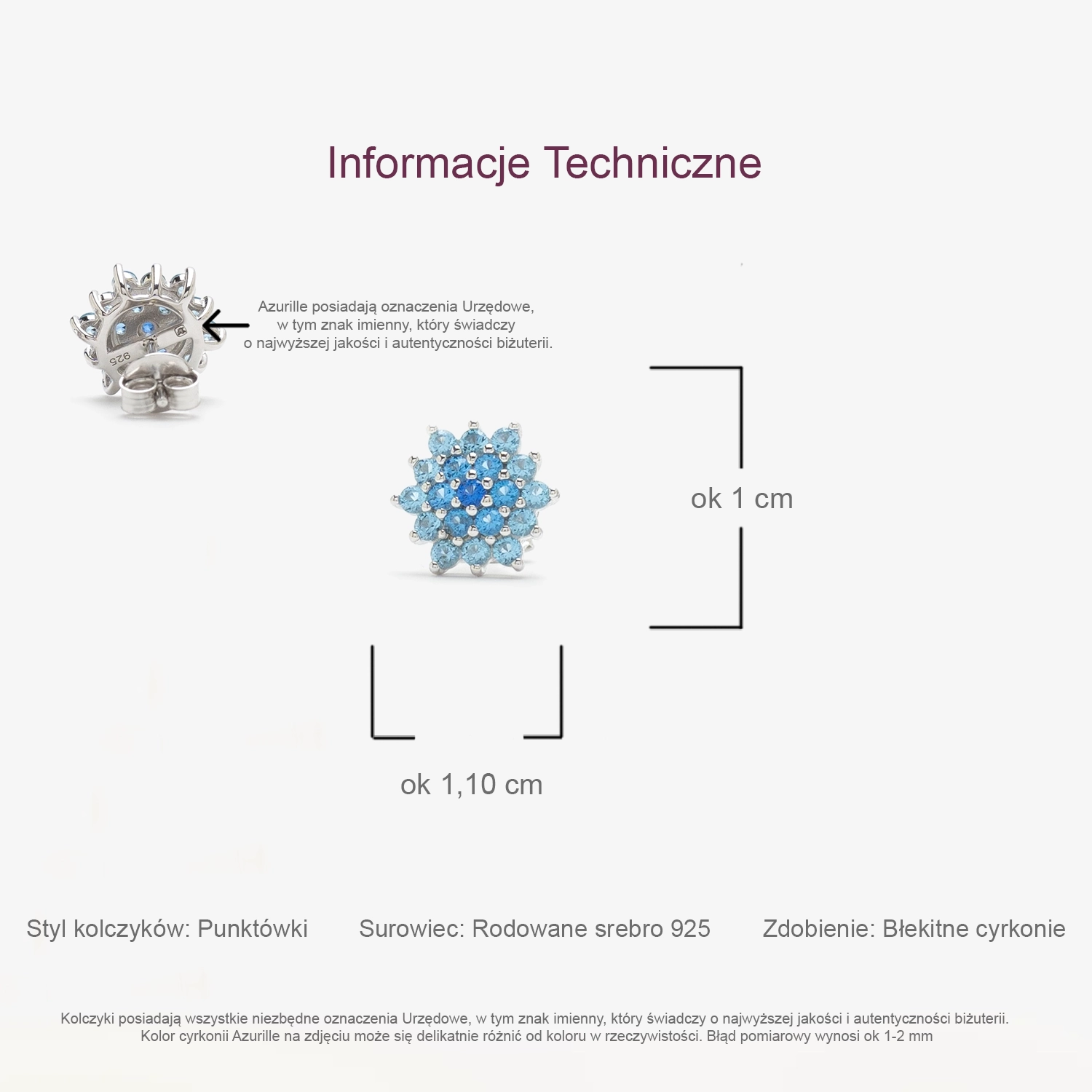 Robimy wszystko, aby kolory wiernie odzwierciedlały rzeczywistość. Jednak odcień srebrnego, błękitnego koloru kolczyków i cyrkonii, może się nieznacznie różnić w rzeczywistości, od koloru tego na zdjęciu. Jest to spowodowane specyfiką ustawienia monitora, światła, w jakim oglądasz zdjęcie. W szczególności dotyczy to pozłacanych elementów.