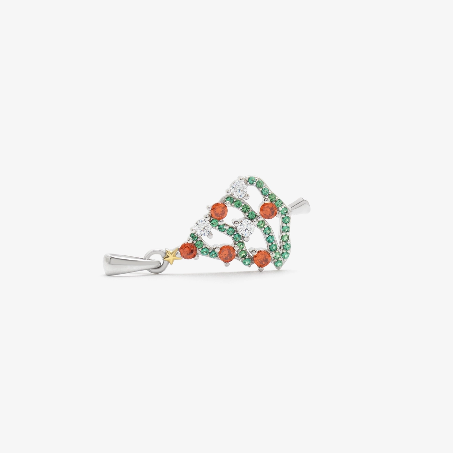 Choinkilla ma formę minimalistycznej choinki, którą wykonano ze srebra 925. Została starannie wyprofilowana po to, aby uzyskać przestrzenną i harmonijną sylwetkę. Zielone cyrkonie imitują drobne gałązki, a także odbijają światło i tworzą subtelny efekt śniegu, który delikatnie podkreśla uroczysty charakter looku. Czerwone kamienie przypominają bombki i wprowadzają ciepło, jednocześnie budząc skojarzenia z chwilami spędzanymi przy wigilijnym stole. Ręcznie malowana złota gwiazdka, dodaje całości klasycznego uroku i świątecznego blasku. Białe cyrkonie odwołują się do płatków śniegu.