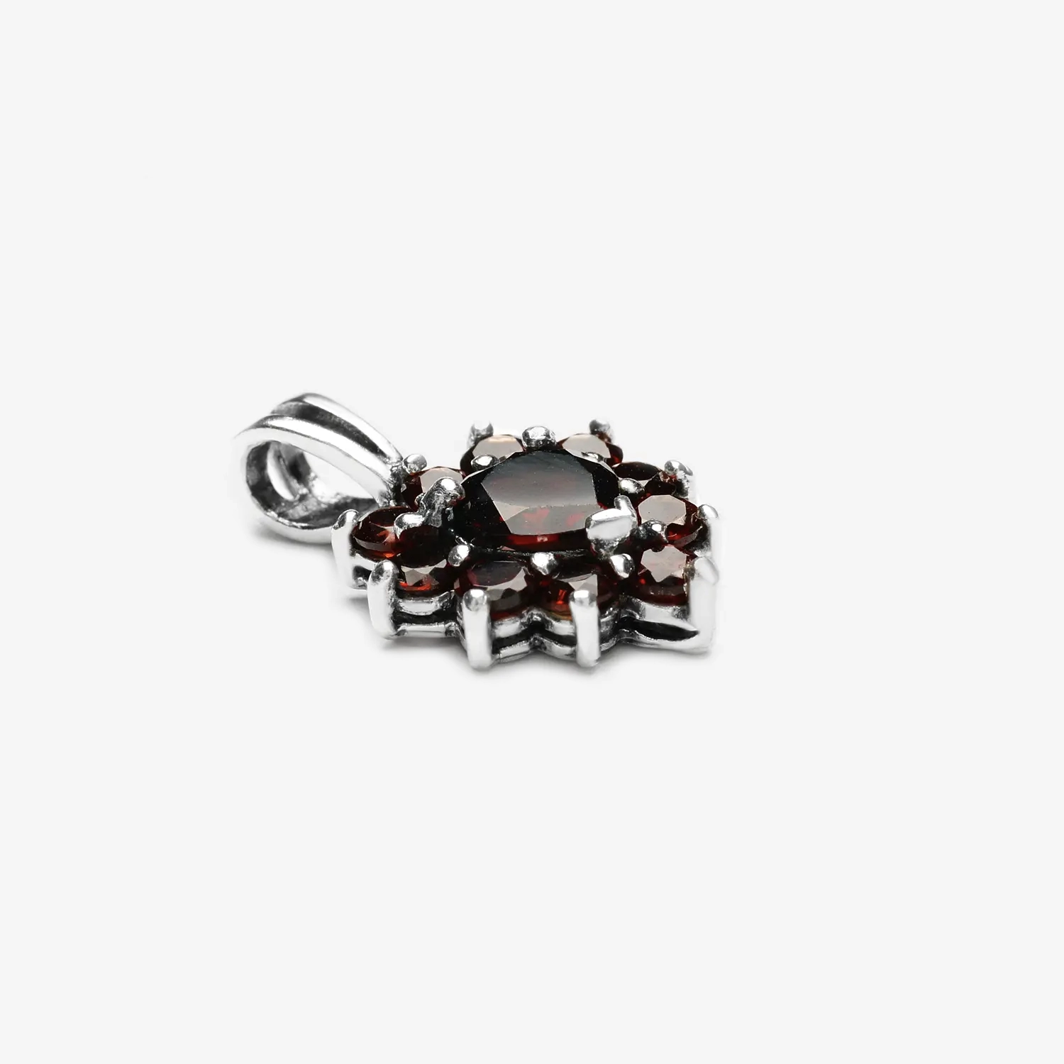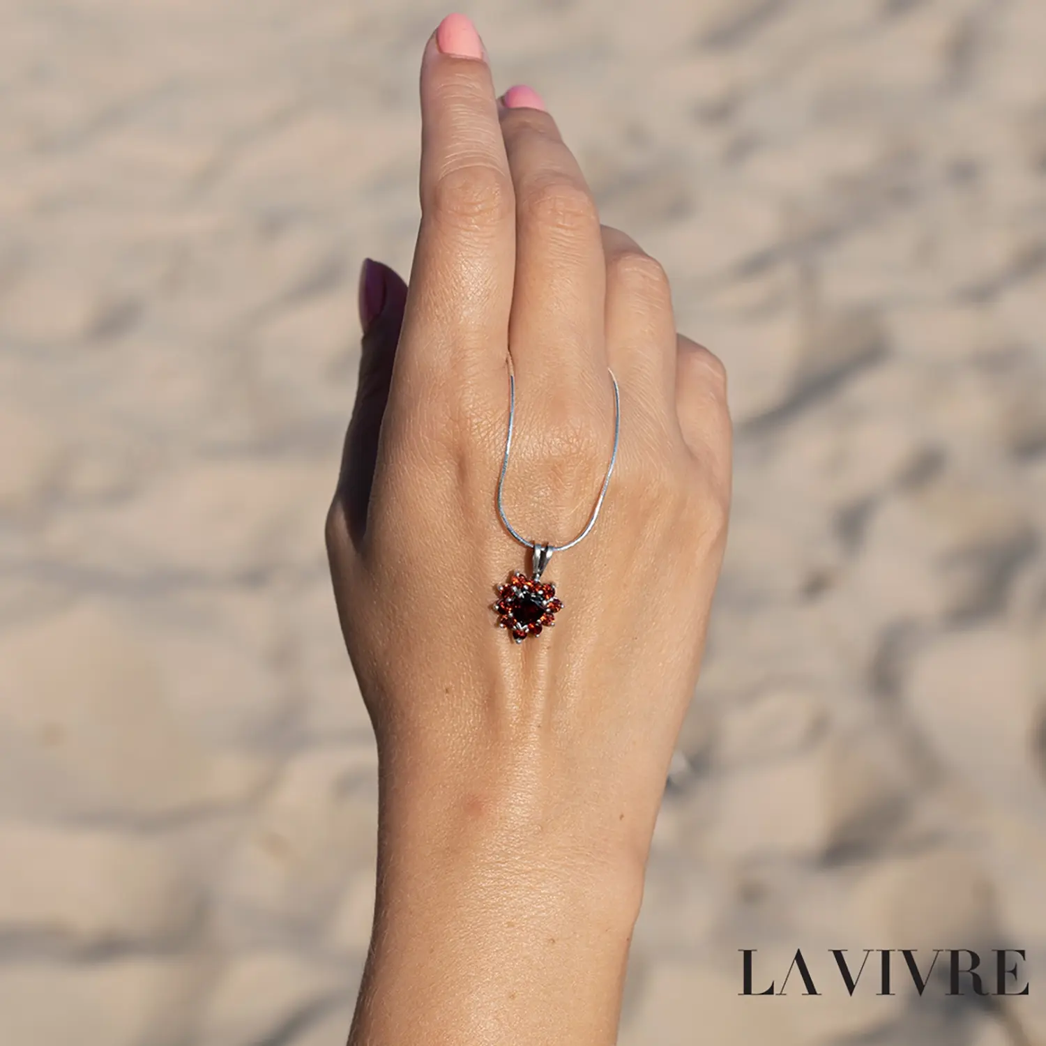Granaty o intensywnej, głębokiej czerwonej barwie są kamieniami, które od wieków symbolizują miłość, pasję i oddanie. Czerwień granatów nie jest przypadkowa. To kolor serca symbolizujący najgłębsze uczucia, pragnienia i emocje. Granaty w tej zawieszce przypominają o miłości, która jest nie tylko namiętna ale i trwała, niezłomna, gotowa przetrwać wszelkie przeciwności. To uczucie, które jest gotowe na poświęcenie i oddanie aż po grób.